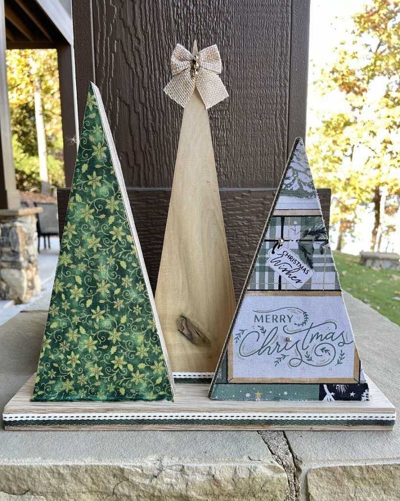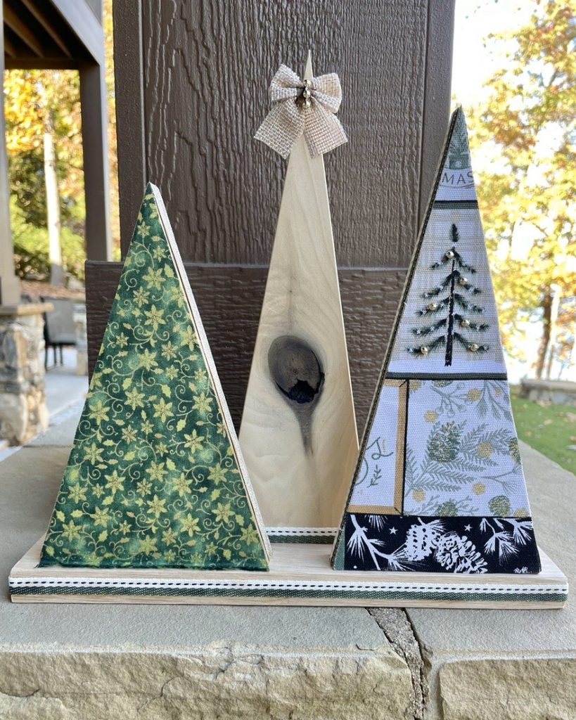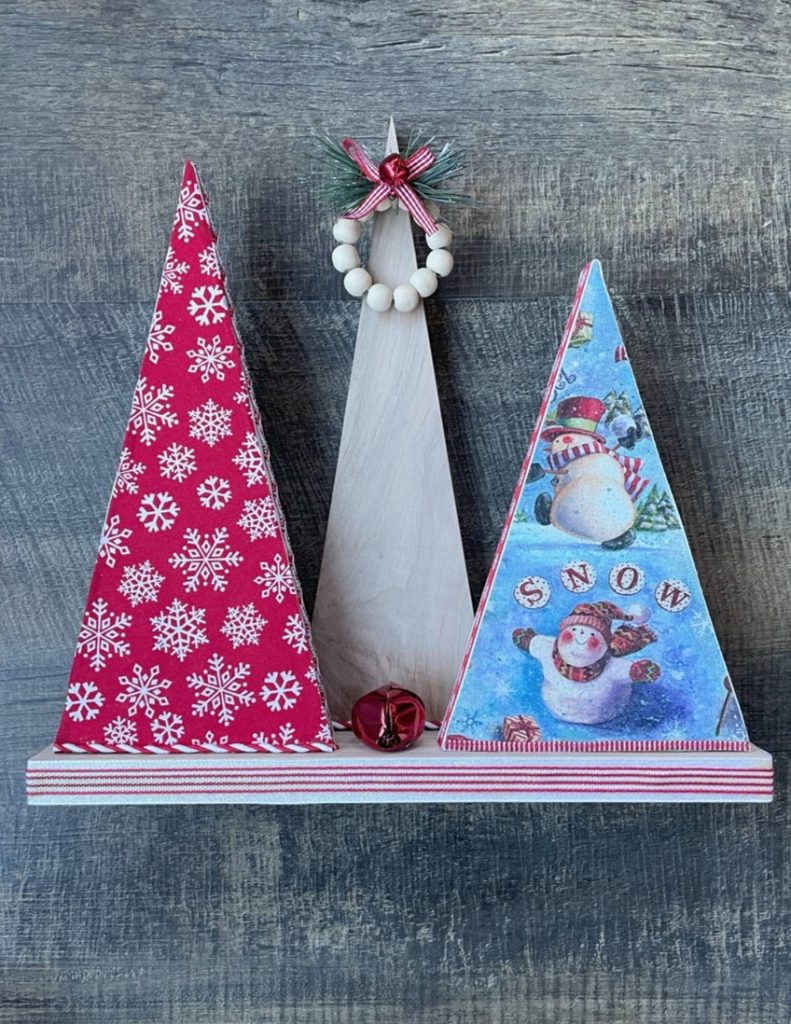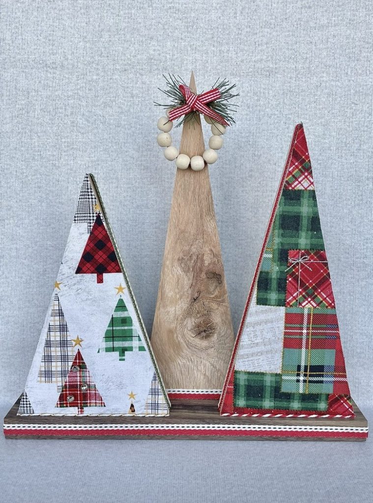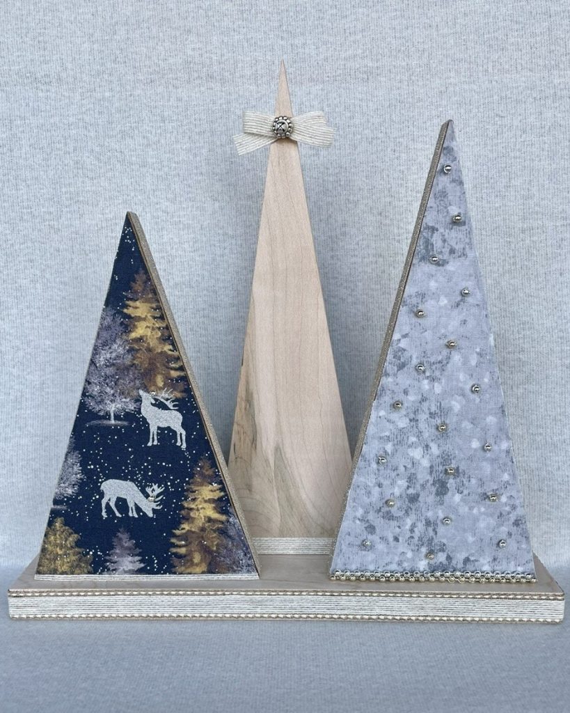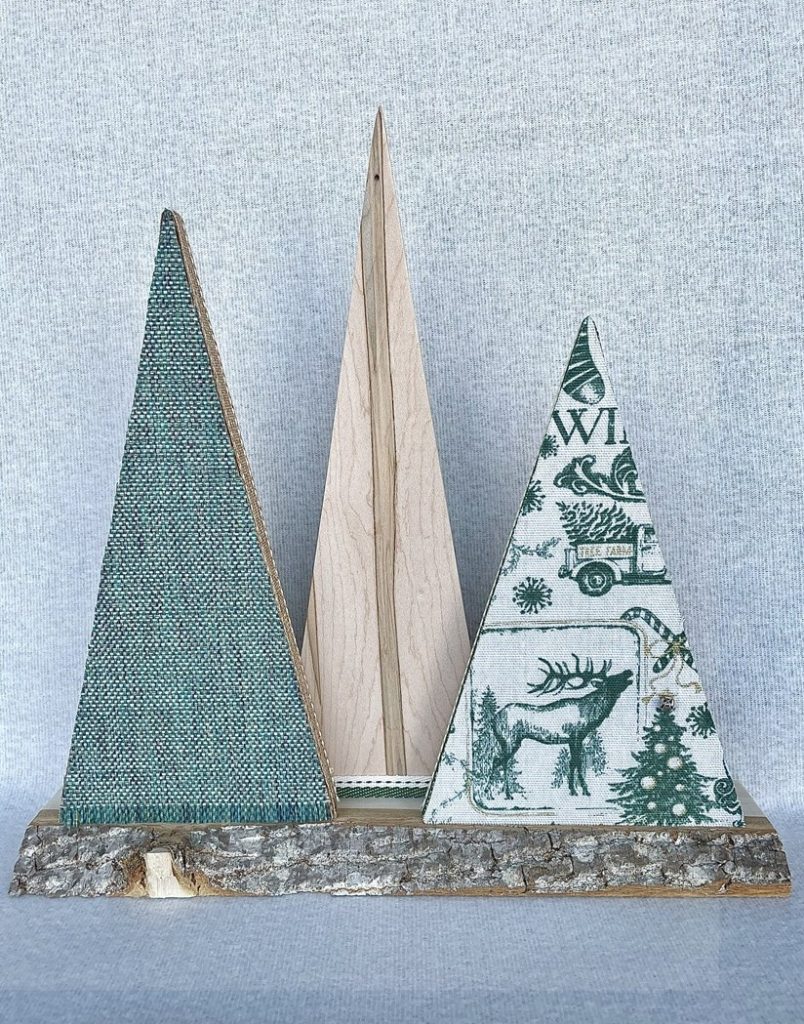 Christmas Tree-o’s (trio of trees) are crafted from solid wood. All Tree-o’s are different in that each wood piece is unique, and fabric used on a tree may differ depending on which area of the fabric is used (as far as the pattern on it). Tree-o’s: $20