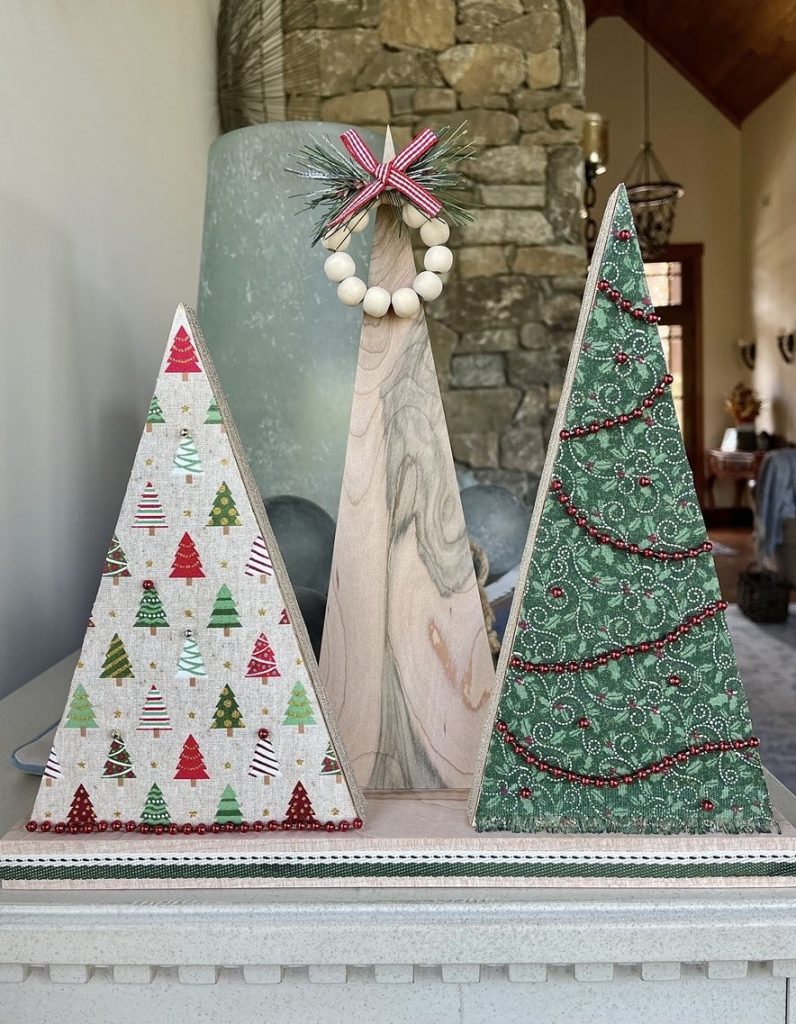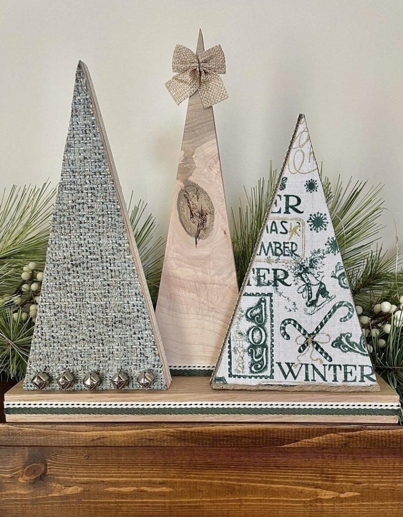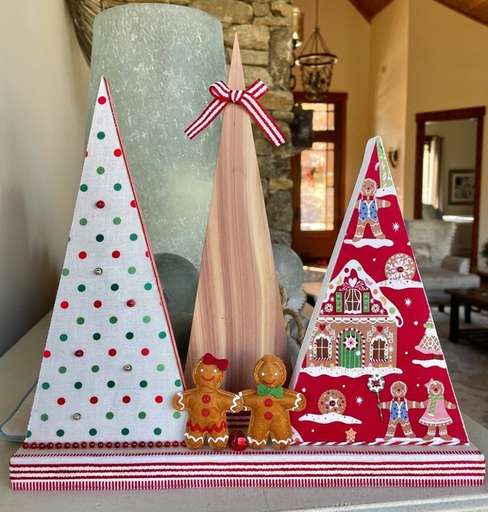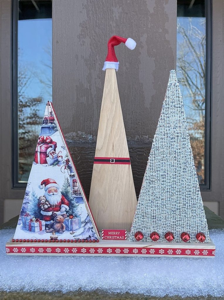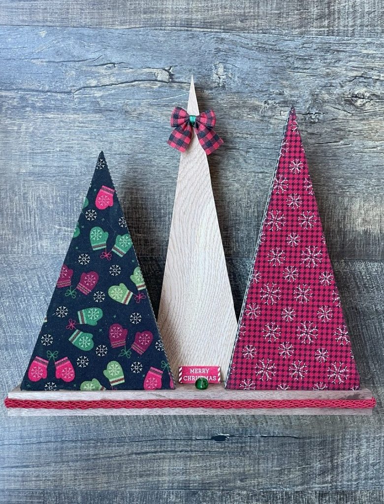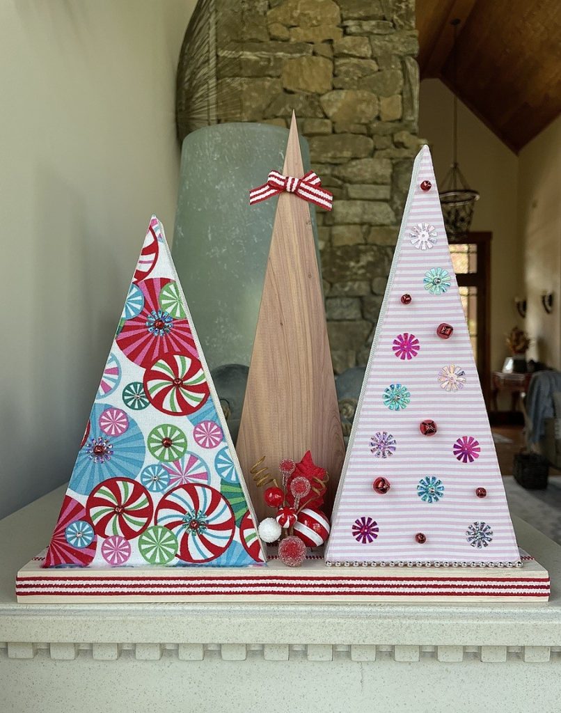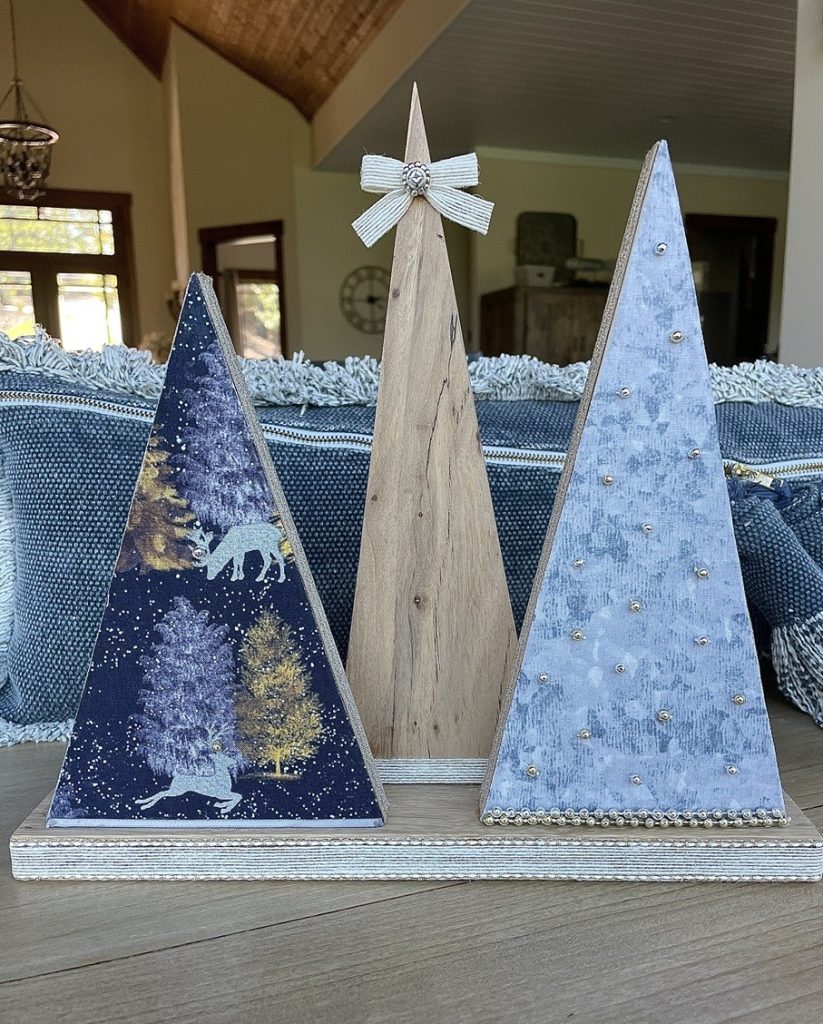 Christmas Tree-o’s (trio of trees) are crafted from solid wood. All Tree-o’s are different in that each wood piece is unique, and fabric used on a tree may differ depending on which area of the fabric is used (as far as the pattern on it). Tree-o’s: $20