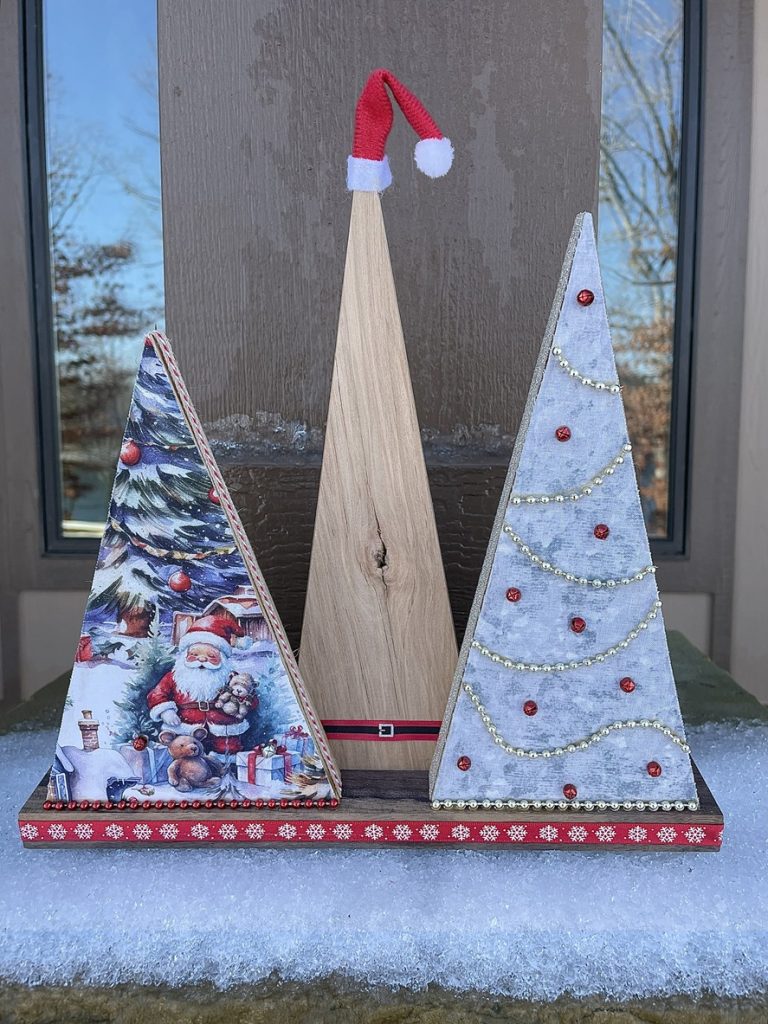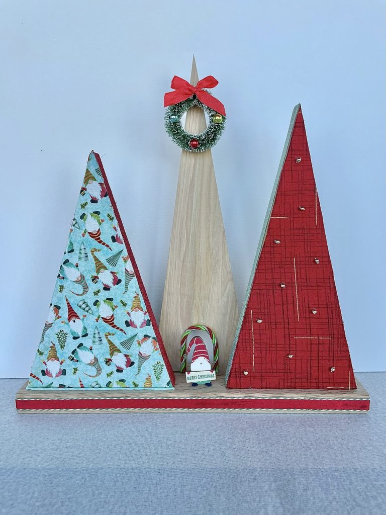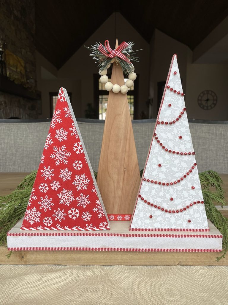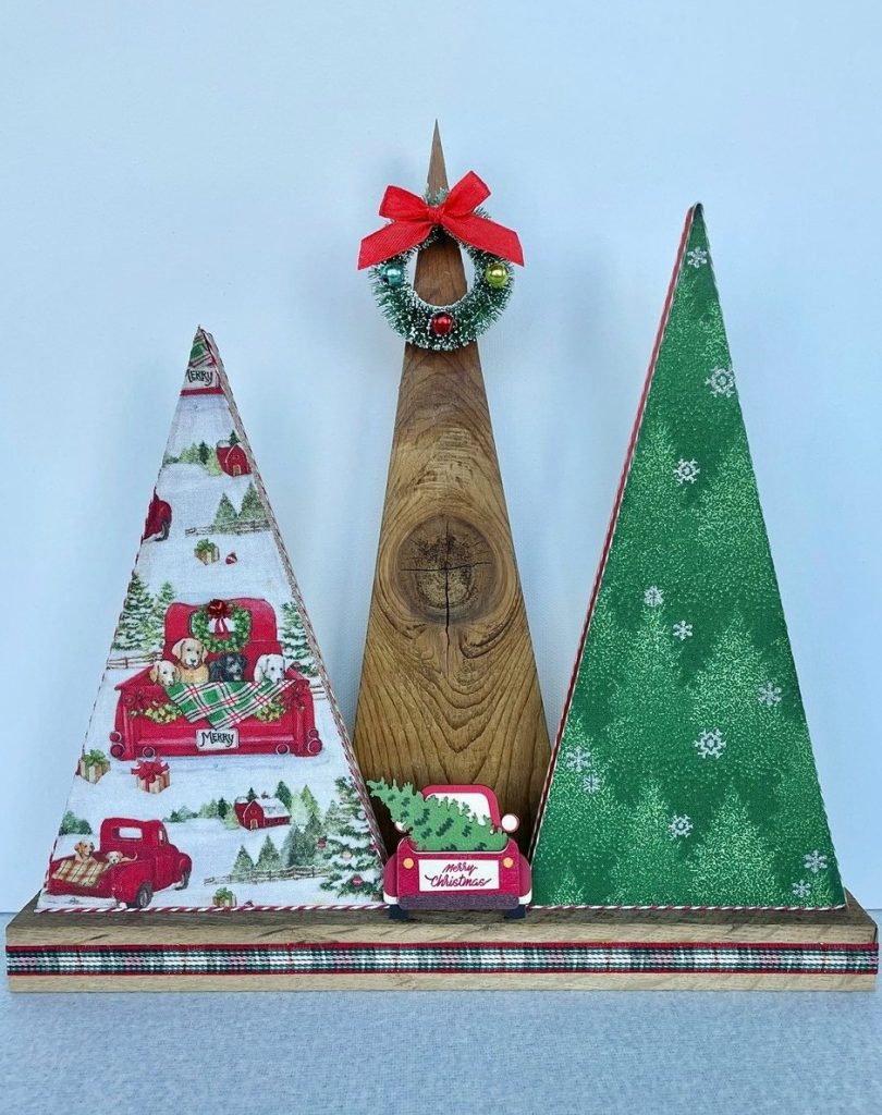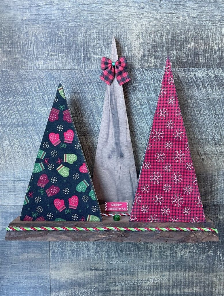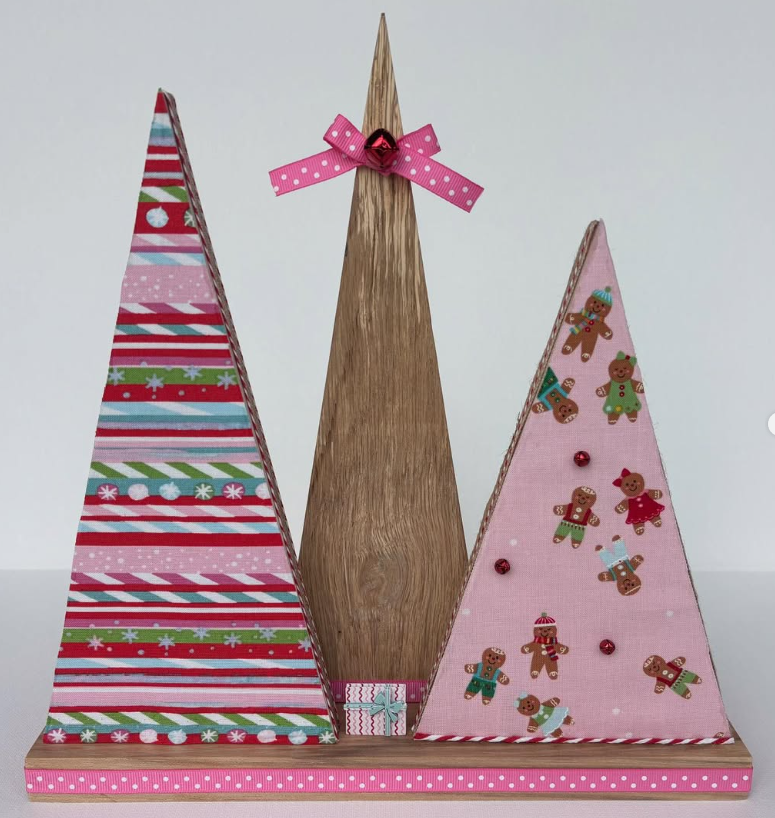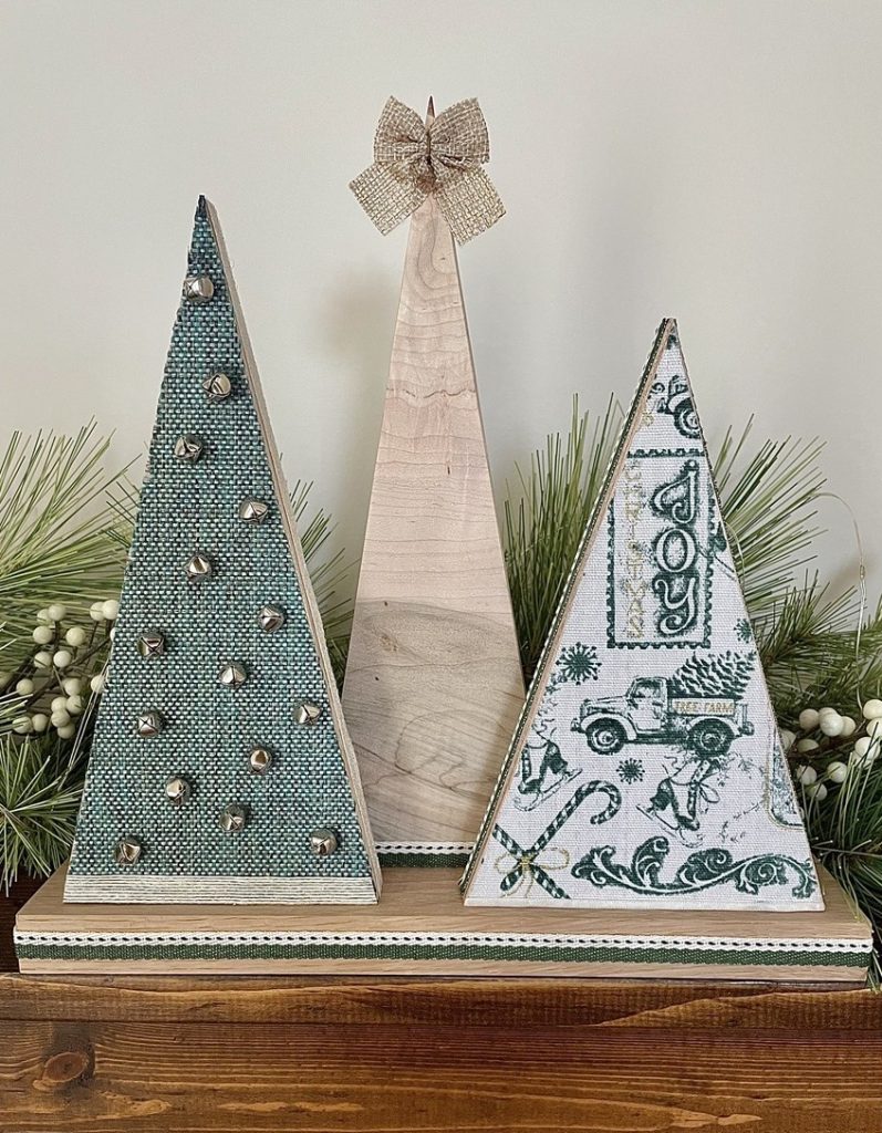Christmas Tree-o’s (trio of trees) are crafted from solid wood. All Tree-o’s are different in that each wood piece is unique, and fabric used on a tree may differ depending on which area of the fabric is used (as far as the pattern on it). Tree-o’s: $20