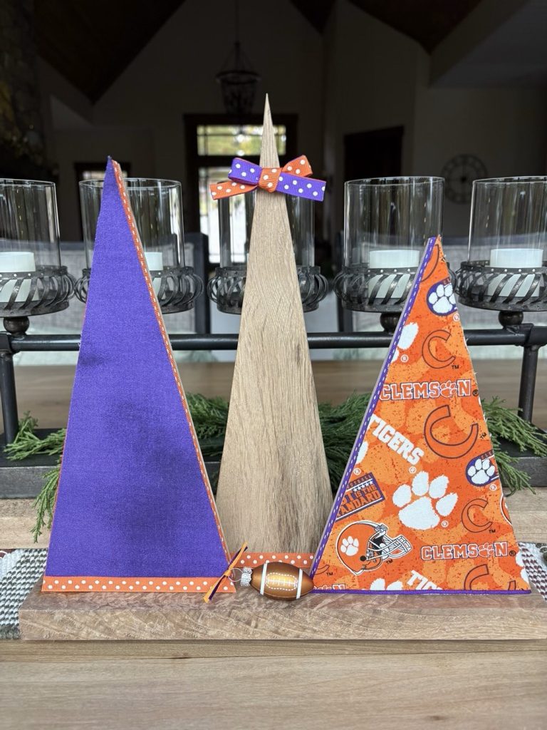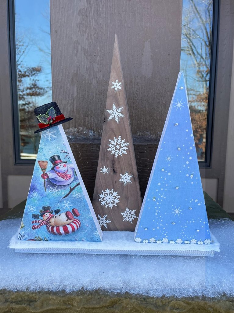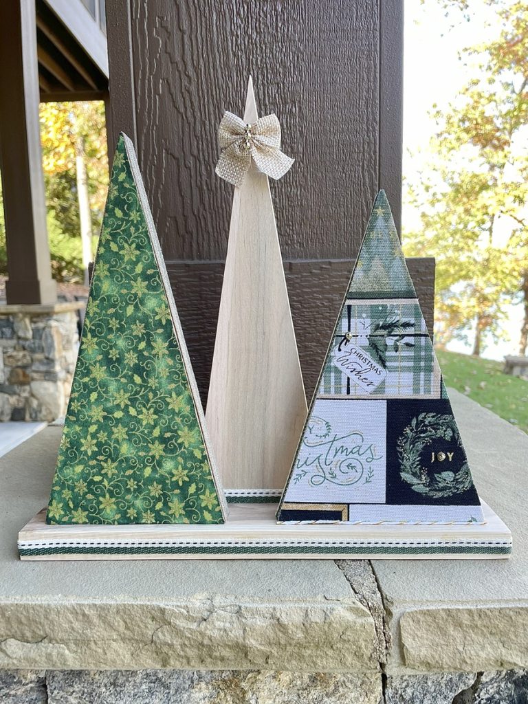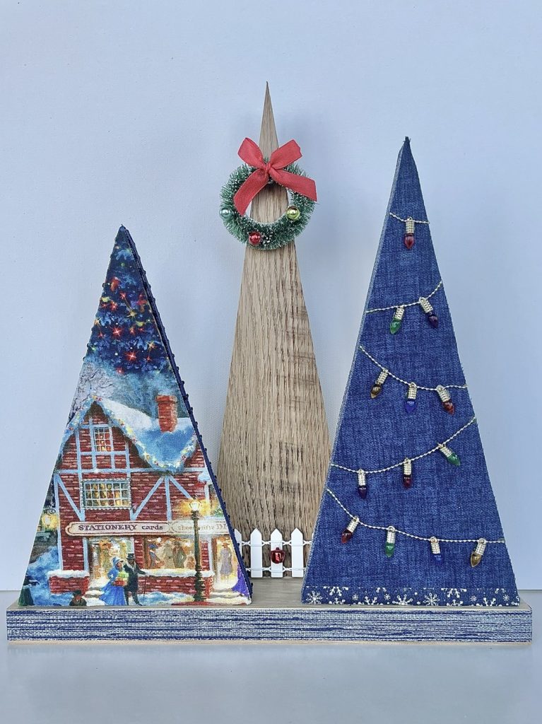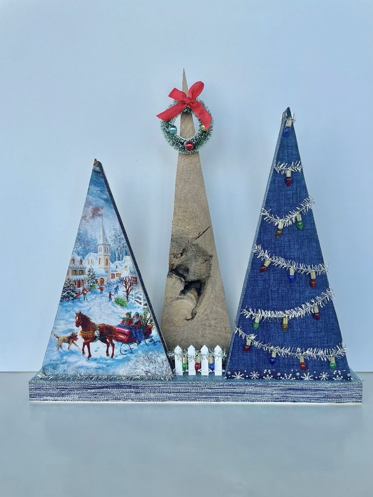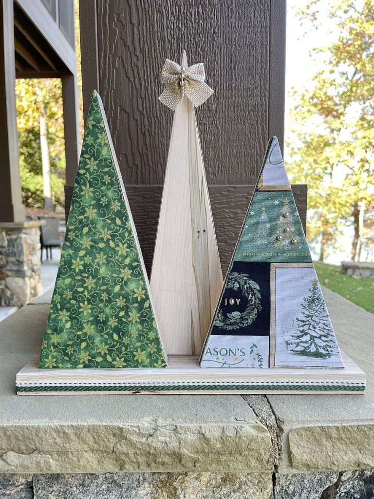 Christmas Tree-o’s (trio of trees) are crafted from solid wood. All Tree-o’s are different in that each wood piece is unique, and fabric used on a tree may differ depending on which area of the fabric is used (as far as the pattern on it). Tree-o’s: $20