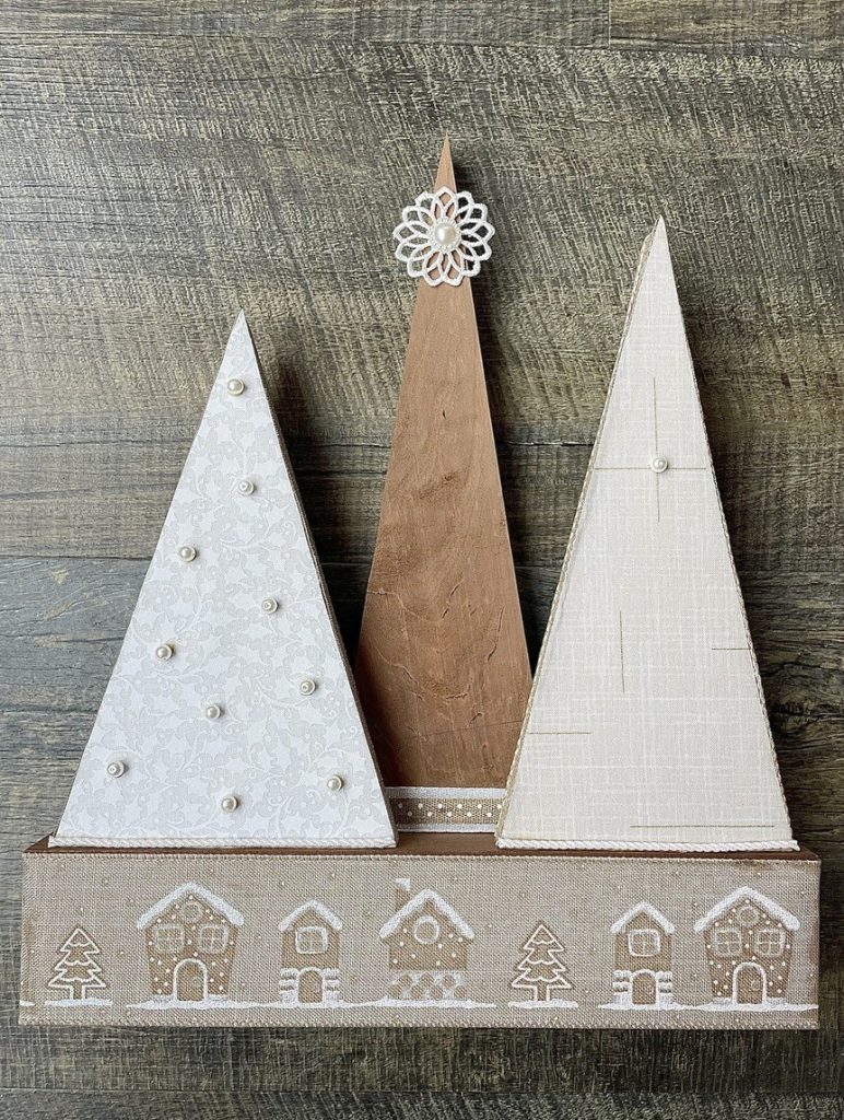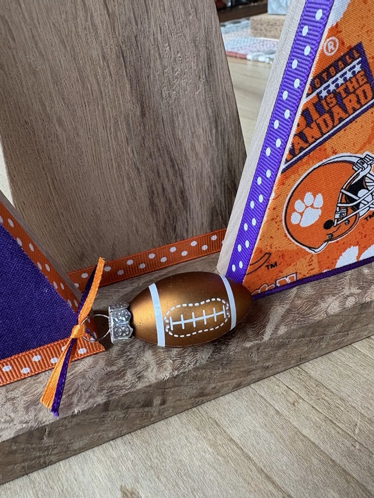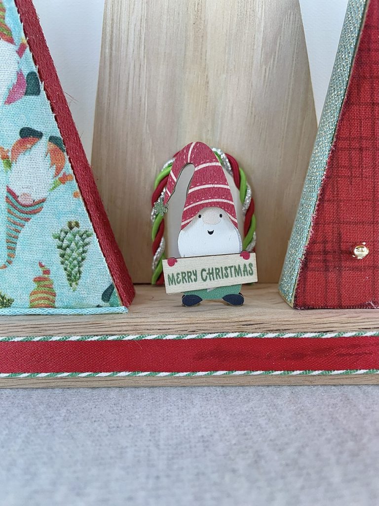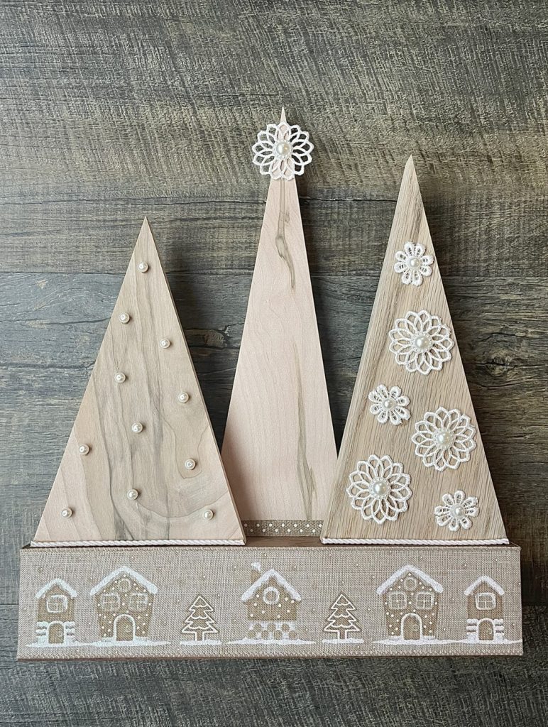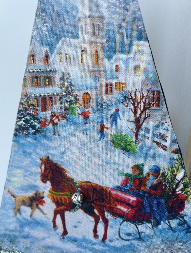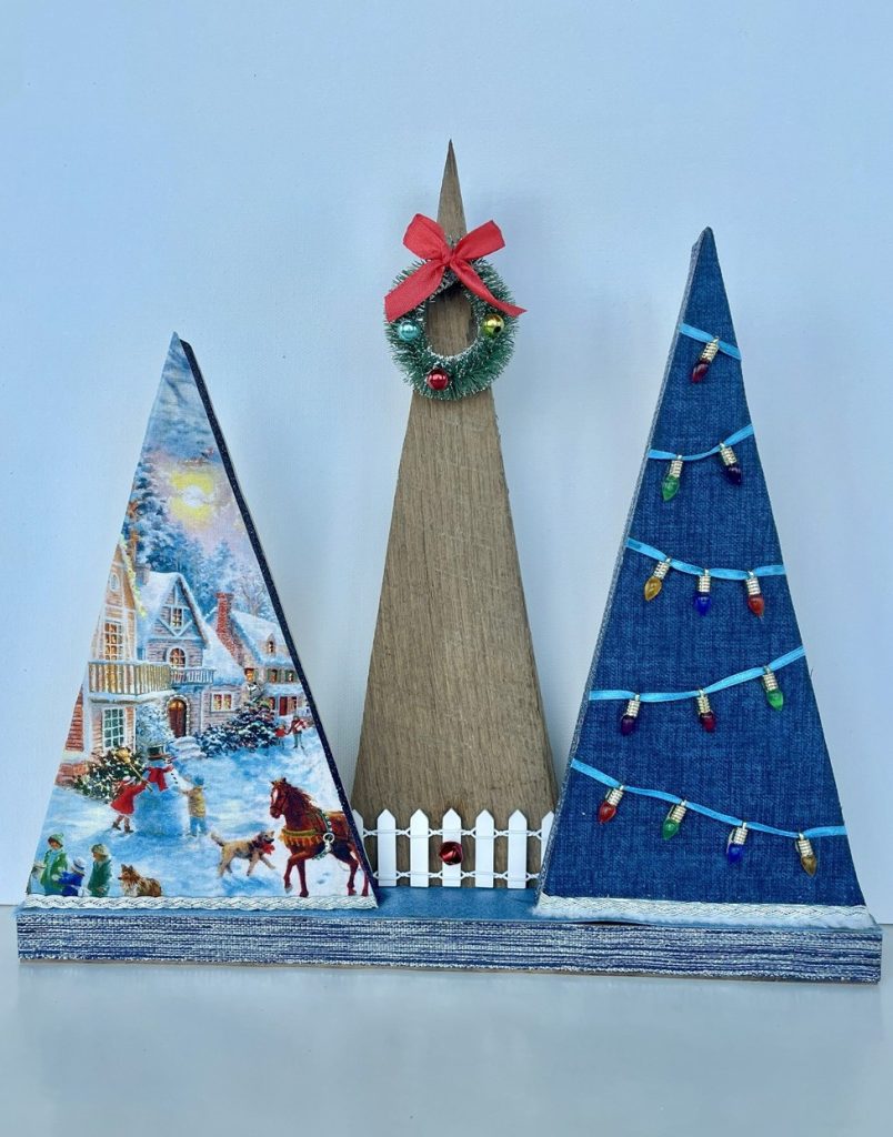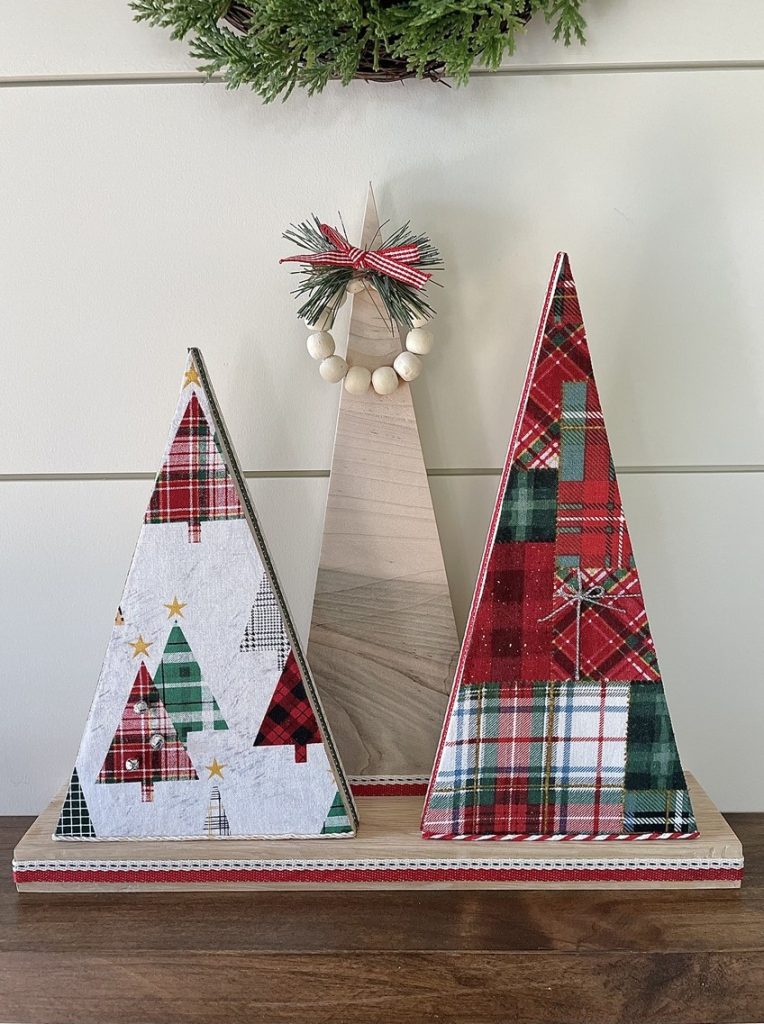 Christmas Tree-o’s (trio of trees) are crafted from solid wood. All Tree-o’s are different in that each wood piece is unique, and fabric used on a tree may differ depending on which area of the fabric is used (as far as the pattern on it). Tree-o’s: $20